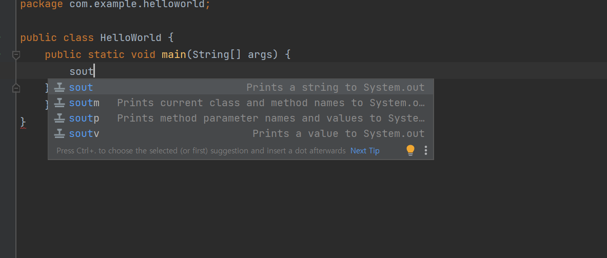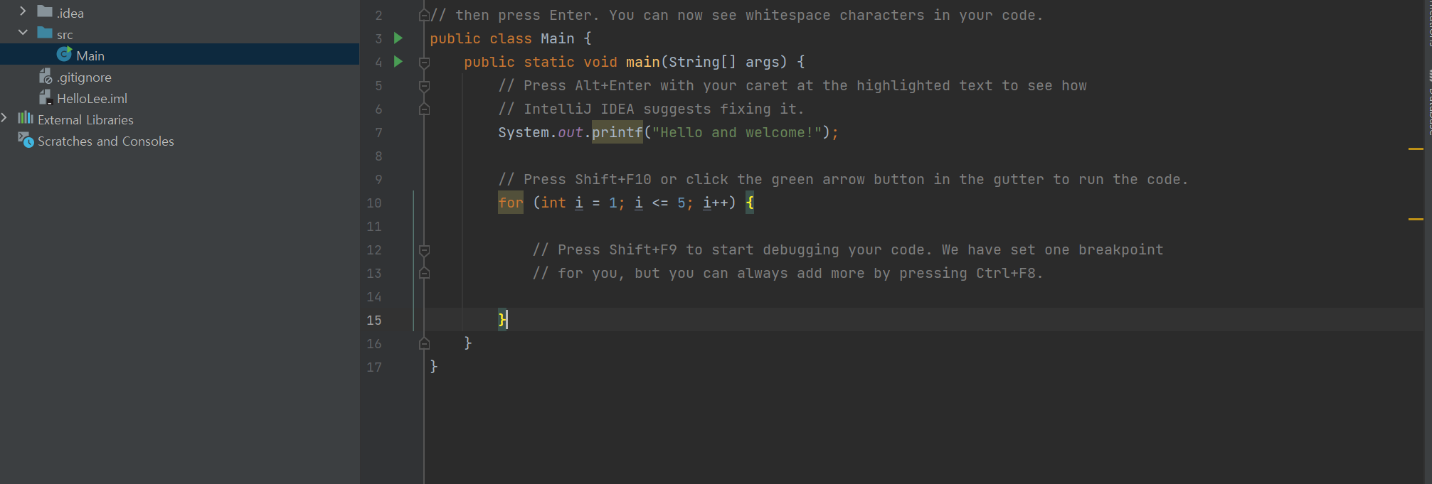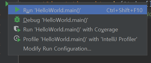 옆 재생 버튼을 누르면 Run "HelloWorld.main() 클릭해본다.