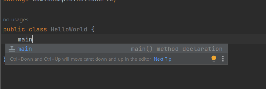 sout 안에 "Hello World" 라고 적어본다.