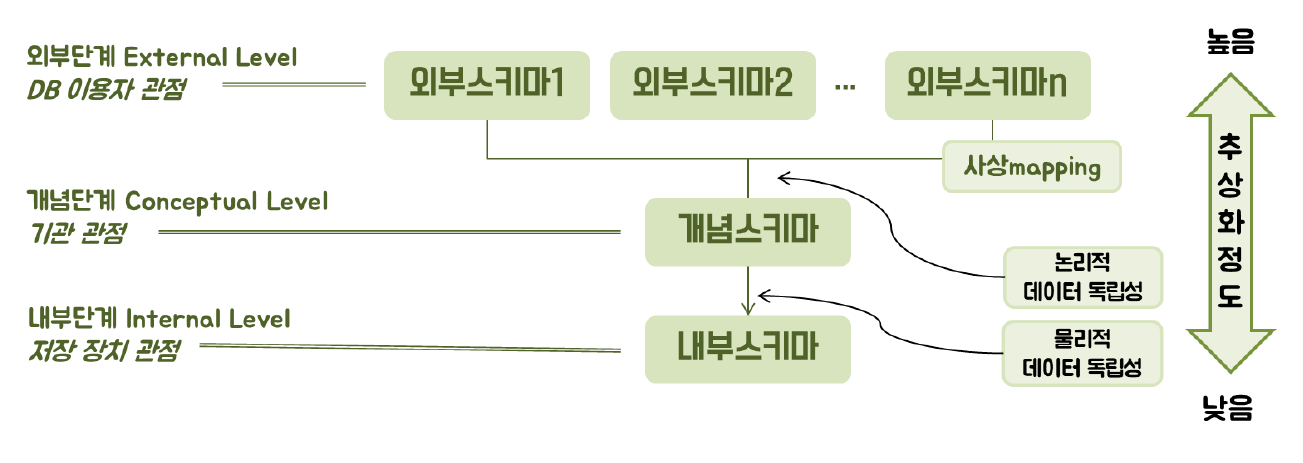 사용자, 설계자, 개발자가 DB를 보는 관점에 따라 DB를 기술하고 이 관계를 정리한 ANSI표준으로 , DB의 독립성을 확보